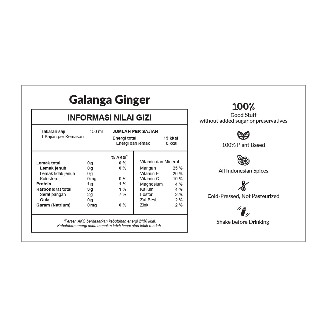 One of Re.juve Wellness SHOTs series that consists of 4 Bottles of Galanga Ginger SHOTs, where galangal known to be ancient remedy for coughs and respiratory problems, and ginger that is known for its anti-inflammatory and immune-boosting properties.
